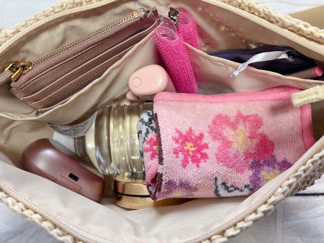 ペットボトルを入れるとコスメポーチが入らないため、最低限持ち歩きたいコスメ類はポケットにイン。