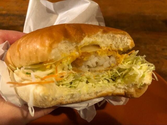 分厚めのバンズとサクサクのフィッシュフライにたっぷりのチーズとタルタルソースが染み込んでいるのがまたたまりませんね。シャキシャキのキャベツとにんじんの食感と味がいいアクセントになっており、飽きずに食べ進められます。
