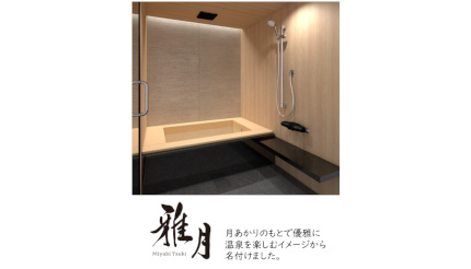 「雅月」シリーズは、温泉宿の「非日常」を自宅で楽しんでもらいたい、との思いから開発されたシリーズで、天然素材や伝統工芸品で温泉宿のような「非日常」を味わいつつも、浴室空間としての快適さを損なわないよう、同社の樹脂成形技術を融合させた完全受注生産モデル。
