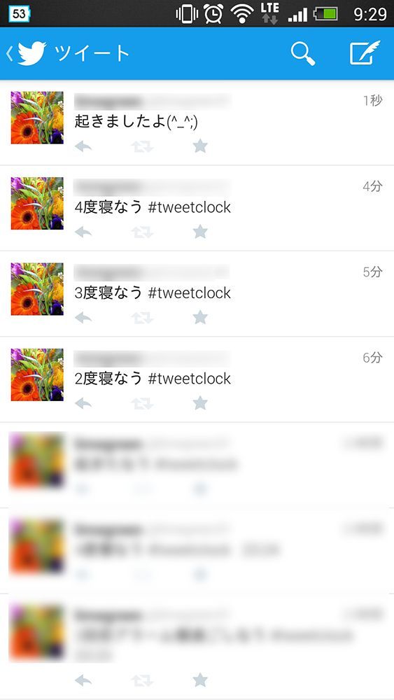 普段使っているTwitterアカウントを設定して試してみました。1回目のアラーム。おもむろにスヌーズを使う。ただ、そのあとのことはよく覚えていません。音量の設定を低めに設定していたのが災いしたのか、3回まで設定できるスヌーズを、すっかり使い果たしてしまったようで……。Twitterをみると「4度寝なう」の文字が! アプリのせいというより、気持ちのもちようですね……。