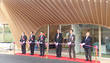 建築家の隈氏は「葉田会長から話を聞いたとき、夢のある地域の一つのモデルになるプロジェクトだなと思い、とても感激しました。建物のデザインは曲線を使って、まわりの山並みに馴染むようにしました。また軒はできるだけ低く抑えて、中はゆったりできる空間をとりました」と、緑に囲まれた環境に溶け込むようなデザインについて語った。