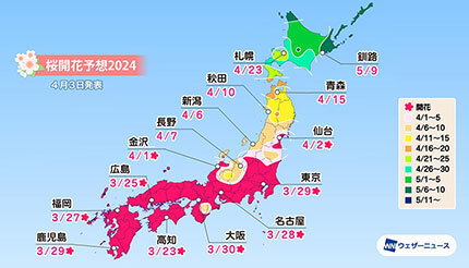4月2日には仙台で開花するなど、桜前線は東北南部を北上しており、これから開花を迎える北日本では平年よりも開花が早まる見込みとなっている。来週には東北北部で開花し、同社は北海道での桜が咲き始めを4月下旬からと予想する。