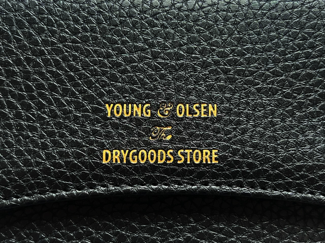 長財布のフロントのセンターには、「YOUNG & OLSEN The DRYGOODS STORE」のゴールドの箔押しのロゴ付き。