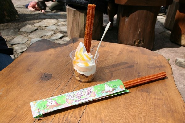 また、デザートではもう一つ、スプラッシュマウンテンがあるクリッターカントリーの奥、「ラケッティのラクーンサルーン」で販売されている、クリッターサンデーがおすすめ。オレンジとミルクのミックスソフトクリームと一緒に、キャロットチュロス(オレンジシュガー)も楽しめてしまう一品です。