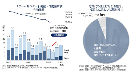 2023年度には、ゲームセンターの倒産や休廃業などが18件発生しており、2022年度に続いて2年連続で増加するとともに、過去5年間で最多を更新している。帝国データバンクの調査によれば、ゲームセンターの店舗数は10年間で8000店近く減少するなど右肩下がりで推移し、直近5年間では3割減となるなど、淘汰の波が押し寄せているという。