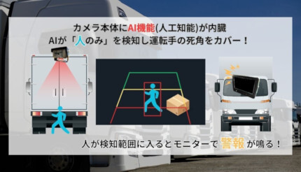 「AITC-1001S」は、本体にAIを搭載しており、人間の形や動きからAIが「人」のみを検知するAIバックカメラ。「人」を検知すると連動してモニタから警報音が発せられ、運転手に危険を知らせることによって人身事故を未然に防げる。