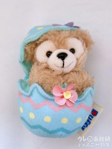 クリーム色にピンクのお花の模様のたまご。メイちゃんのポーズもダッフィーとほぼお揃い。
