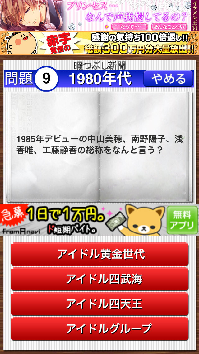 このアプリでは1980年代、1990年代、2000年代から好きな年代を選択することで、当時の世相に関連したクイズを楽しむことができます。普段はうっとうしい上司の「俺の若いころはな~」なんていう話も、「元祖国民的美少女、後藤久美子さんの通称は?」「代々木公園横でディスコダンスを踊る集団は何という?」など時代を象徴するクイズと一緒に聞いてみると案外面白いかも。