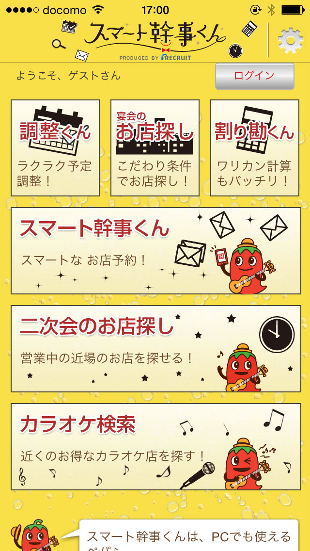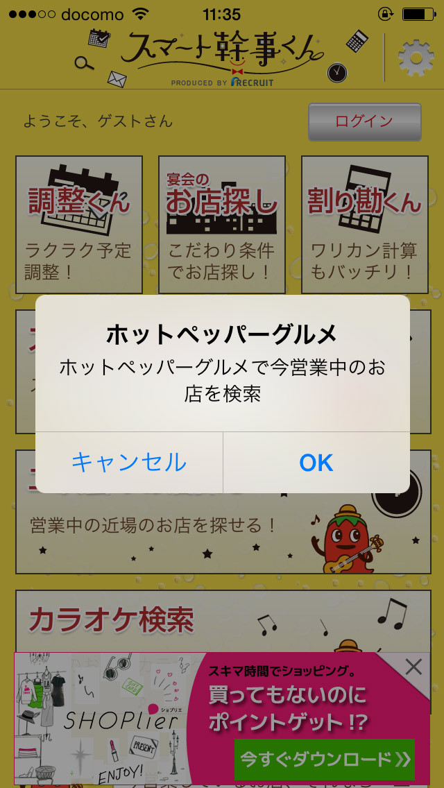 しかもこのアプリには、今いる場所の近くで現在営業中の店を検索できる「二次会のお店探し」機能付き。インストールしておいたグルメ情報検索アプリ「ホットペッパーグルメ」に収録された情報の中から、面倒な入力なしに候補のお店をピックアップできます。