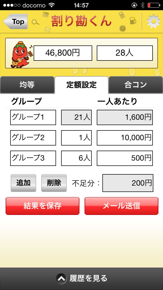 総額を均等に分ける「均等」モード、1.5倍など比率で2グループ間に支払額の差を付けられる「合コン」モード、総額とグループごとの人数、基準となるグループの金額を入力することで、各人の支払額を算出する「定額」モードがあるので、自分たちの支払いスタイルによって選択できます。