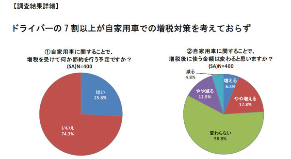 なんと74.3%のドライバーが、消費税増税に合わせて、「特に車への出費は変化させない」と回答しており、増税後に車を使う金額も58.8%が変わらないと答えており、消費税増税に対するあきらめとも見える姿勢になってしまっています。