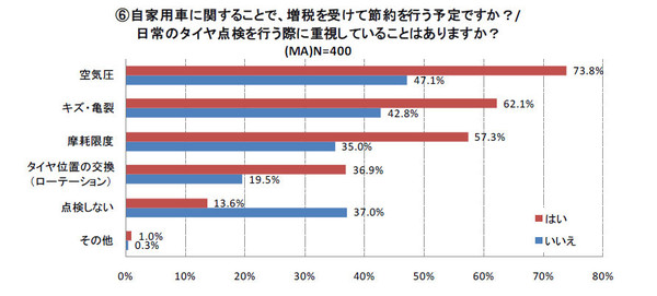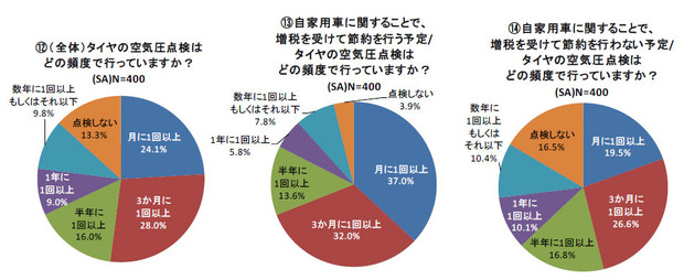 一方で何らかの増税対策を検討し行っている人(増税対策派)は、日頃から燃費を意識した運転を行っていることが多く、タイヤの空気圧点検への意識は73.8%と極めて高い数値を示しました。「空気圧の適正化で燃費を節約できるなら定期的に行いたい」との声もあり、増税対策派は節約意識も点検意識も高いドライバーが多いとの結果になりました。