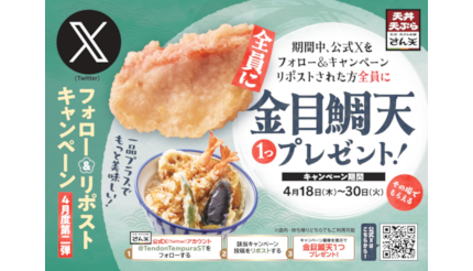 天丼・天ぷら本舗 さん天、公式Xアカウントのフォロー&リポストで「金目鯛天」がもらえるキャンペーン