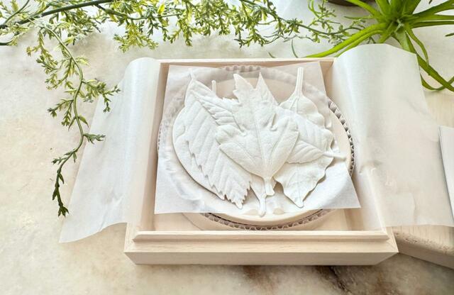 箱をあけると、6枚の葉っぱのお香と、素焼きのお皿、不燃性のフェルトがセットで入っています。
