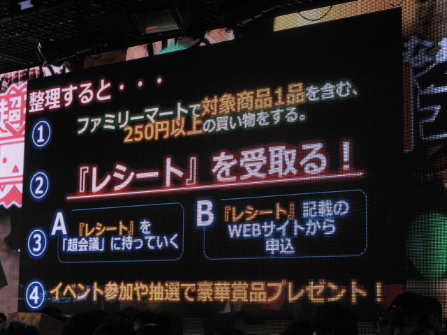 しかし、タダで参加できるわけではありません。まず事前にファミリーマートで対象商品を1品以上含む250円以上のお買い物をして、そのレシートを捨てずに超会議会場のファミマブースへ持っていくと、先着で参加チケット整理券がもらえます(予定)。
