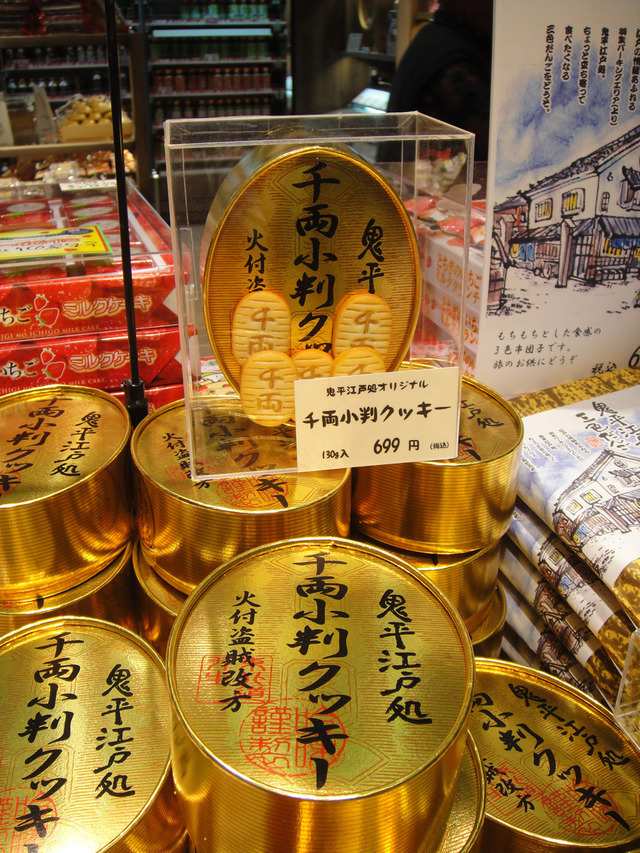 鬼平の物語にちなんだというオリジナルの「喜楽煎餅」や「桐屋の黒飴」、金ピカの「千両小判クッキー」など、話題づくりにも最適なお土産が、まさによりどりみどりの風体で並び、手をこまねいています。