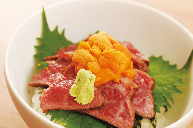 温かいご飯の上にレアステーキ状態の肉を乗せ、さらにウニをトッピングした「芝浦ごはん」(900円) 拡大画像表示