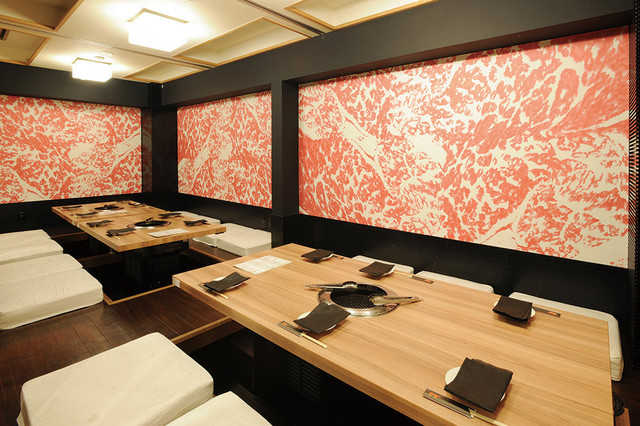 牛肉の模様をイメージした内装。座敷席も用意され、ゆったりとした空間の中で、おいしい肉を味わうことができる 拡大画像表示