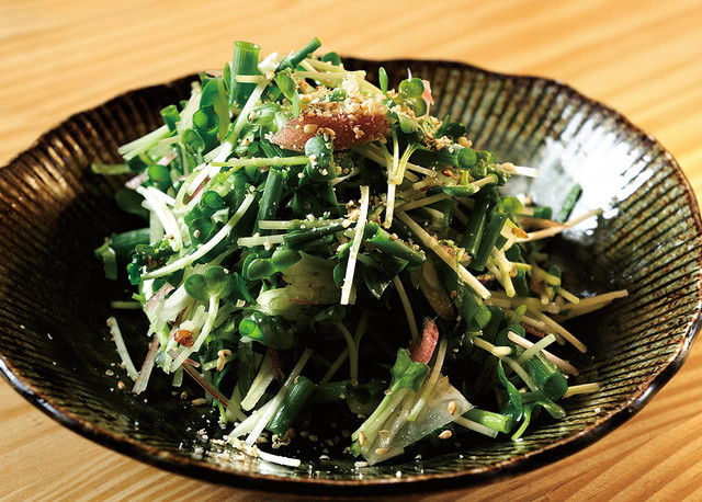 カイワレ、ネギ、シソなどをポン酢風のドレッシングであえた「薬味サラダ」(380円)。肉の合間の箸休めにぴったり 拡大画像表示