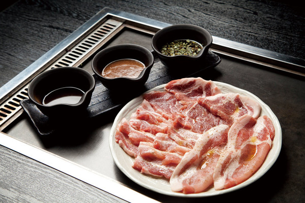 あんしん豚3種盛り合わせ 1850円(約400~500g) オーガニックポークのカルビ、肩ロース、ロースの盛り合わせ。ジンジャーなど、3種類のソースでどうぞ