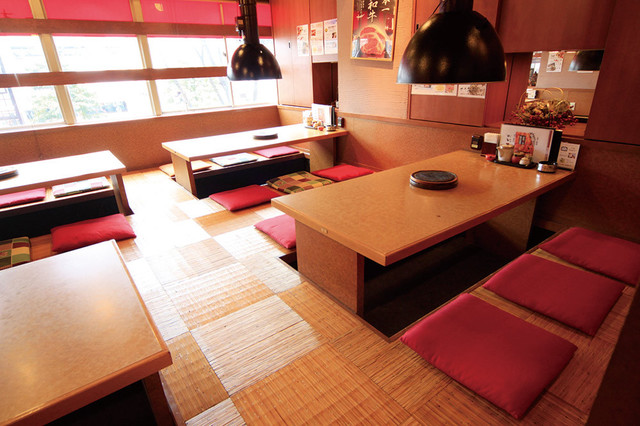 仕切りのある掘りごたつ席が4卓、テーブル席が3卓ある 拡大画像表示