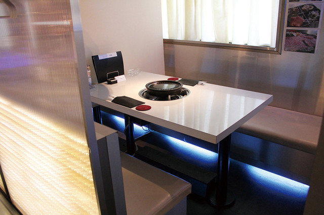 従来の焼肉店のイメージを覆す、LEDに照らされたおしゃれな焼肉ダイニング。あえて銘柄にこだわらず、最高ランクを仕入れる和牛の他、北海道直送のジンギスカンや豚しゃぶしゃぶ、馬刺しなどさまざまな肉料理が味わえる。