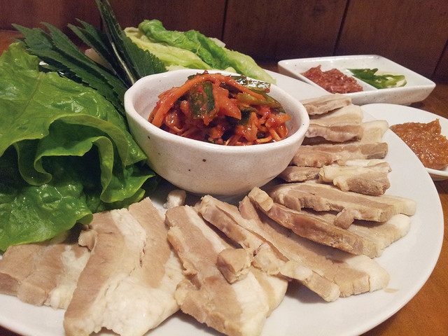 「ゆで豚肉とポッサムキムチ」(2310円)。さっぱりとしたゆで豚とキムチをサンチュに巻いて 拡大画像表示
