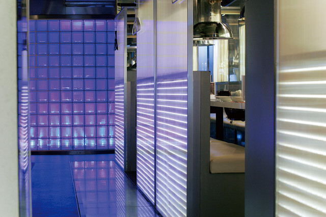 白と黒を基調として、LEDでライトアップされたスタイリッシュな店内 拡大画像表示