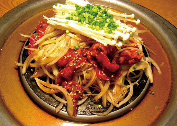 専用石鍋で焼くプルコギが人気で、こちらを目当てに訪れる人もいるほど。甘辛ダレがたっぷりとからんだ細切り牛肉とシャキシャキとした食感のタマネギが食欲をそそる逸品だ。