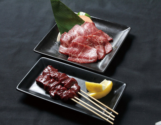 手前の「トロレバ串」(1本350円)は人気NO.1メニュー。奥は希少な「和牛イチボ」(1500円) 拡大画像表示