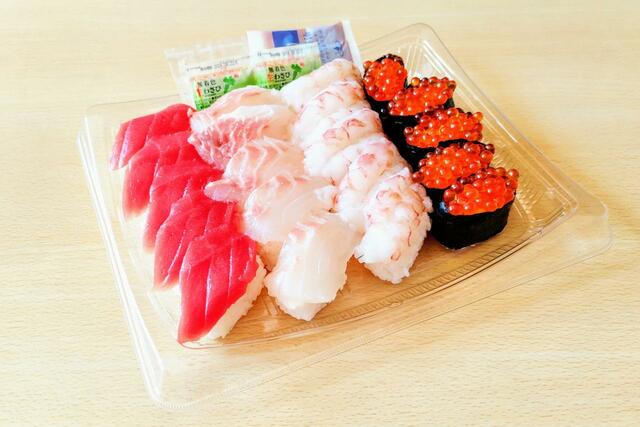 ラインナップは、本マグロ、真鯛、エビ、いくら醬油漬けの4種類で、醤油、わさび、ガリ(しょうが甘酢漬)付き。