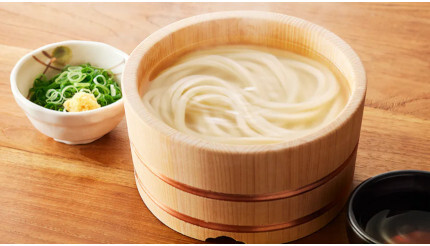 「釜揚げうどん」は丸亀製麺の原点として、約20年前の創業当初から提供しているメニュー。材料は小麦粉と塩、水のみ。茹でたてのうどんを釜からそのまま桶に入れて提供することから、うどん本来の味わいが楽しめる。