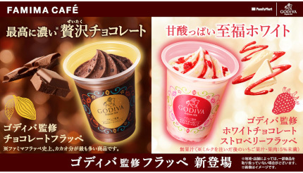 ファミリーマート、ゴディバ監修のチョコレートフラッペとホワイトチョコレートストロベリーフラッペ発売