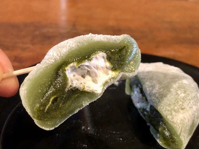 次は「濃い抹茶のクリーム大福」を紹介しましょう。大福の餅きじに抹茶あんとクリームを包んだ一品。