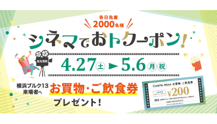 コレットマーレ(神奈川県横浜市)6階の映画館「横浜ブルク13」(運営:ティ・ジョイ)は4月27日~5月6日の期間、各日先着2000人の来場者にコレットマーレで使える200円分の買い物・飲食券をプレゼントしている。