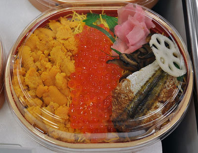 秋田名物の曲ワッパに入れられたちらし弁当。ハタハタ焼きが添えられた秋田ならではのちらしです。特筆すべきはご覧のような蒸しウニの量。これで1折1,260円。