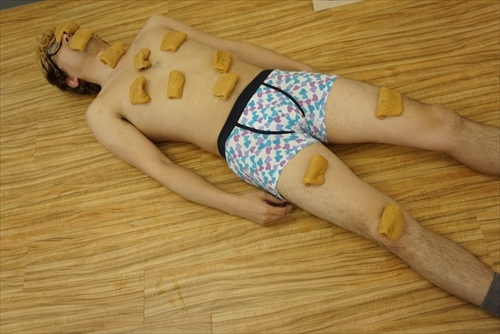 全身のいたるところにどん兵衛のお揚げを乗せてみたのですが、まるで、たくさんの女の子にいろんなところをキスされているような感覚です!