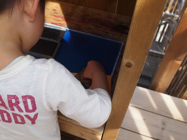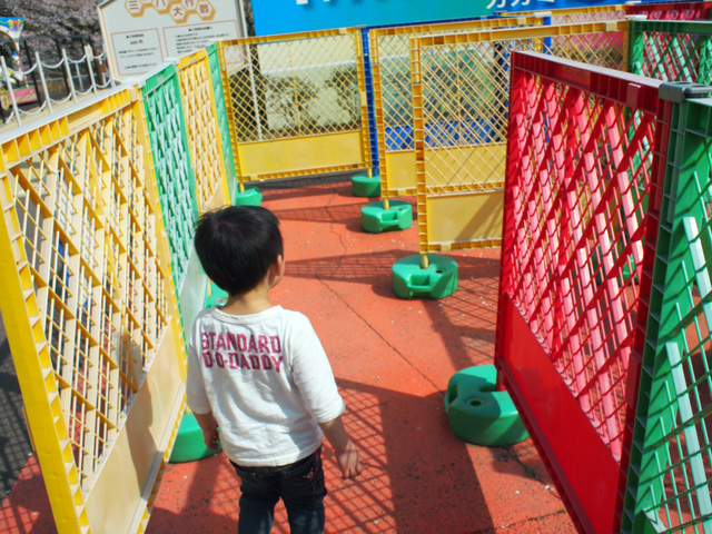 次に「ちびっ子メイズ」にトライ。フェンスに囲まれた迷路なので、これまた親にとっても安心。背の高くないフェンスなので、子供も怖がらず楽しんでました。