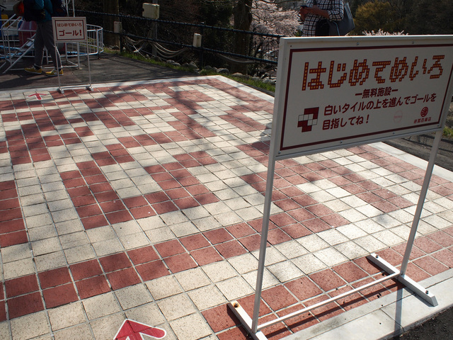 まずは「はじめてめいろ」に挑戦。「はじめてめいろ」は壁が無く地面に埋め込まれたカラフルに塗られたタイルの同じ色をたどってチャレンジする迷路。