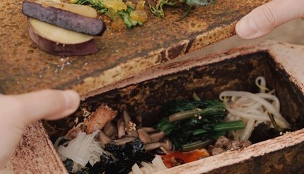 看板料理はずっしりと重いテリーヌポットに入ったピビンパ。蓋の上の前菜には、大原の農家や韓国から仕入れた野菜と、自分たちの畑で採れたものを使う。蓋を取ると手作業で仕込んだ10種類のナムルとご飯が現れ、混ぜ合わせると異なる味と食感が調和する。