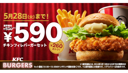 日本ケンタッキー・フライド・チキン(KFC)は5月8~28日の期間、全国のKFC店舗(一部を除く。デリバリーは対象外)で、「チキンフィレバーガーセット590円」キャンペーンを実施する。