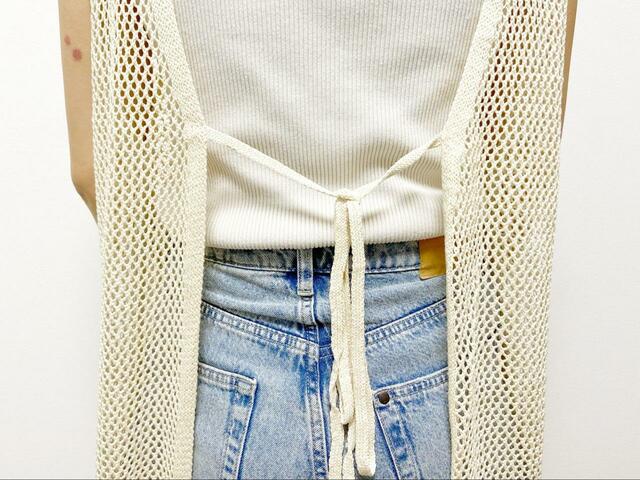 最後は、ちょっと大人なジレ風の着こなしです。フロントリボンを結ばず、ワンピースをジレ風に羽織るだけで、夏に気になりがちな肩周りもさりげなくカバーできますよ。