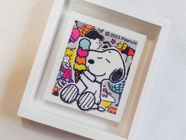 マグネット中央には、カラフルなアイスをもったスヌーピーのイラストが描かれています。額縁は白で、まるで絵画のようなデザインとなっています。