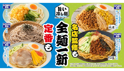 今回の、ファミリーマートにおける冷やし麺のリニューアルでは、さっぽろ純連監修 冷し味噌まぜそばや麺屋こころ監修 冷し台湾風まぜそばに加えて、「定番!さわやか醤油スープ 冷し中華」「石臼挽きそば粉の ざるそば」「北海道産小麦の小麦粉使用 冷したぬきうどん/冷しぶっかけうどん」の全5種をラインアップしている。