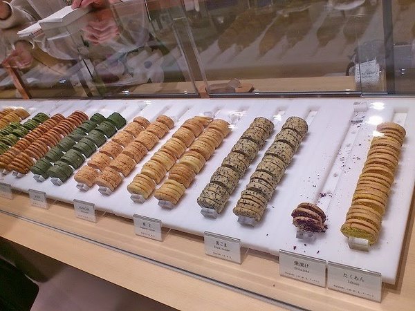 この日は、一番人気の抹茶をはじめ、煎茶、山椒、トマト、柴漬け、柚子などの変わり種12種が並ぶ中、ぶぶあられとたくあんを購入してみました。