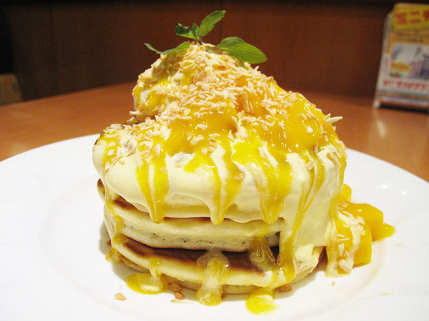 運ばれた瞬間、「マンゴ~!!」と"マンゴーコール"が起きた「マンゴーパンケーキ」。甘さと酸味が絶妙なマンゴーをそのままの形で使ったフレッシュマンゴー、お店で手作りしたマンゴークリーム、マンゴーソースを贅沢に使った、見た目も味も爽やかな一品です。パンケーキの中にはひみつが隠されているそうで…!