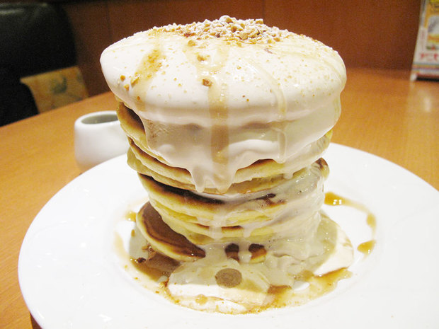 デニーズ開店40周年を記念した「アメリカンフェア」メニューのひとつ「タワーパンケーキ」。アメリカンサイズ(!)の圧巻の6段で登場します。一番上に載っているのは、はちみつと、お店で混ぜ合わせたメープル風味のクリーム。さらに、別添のメープル風味のシロップを上からかけていただきます。