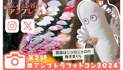 5月25日から、「ムーミン谷とアンブレラ」で撮影した写真を公式Instagram・X上で募集する、第2期「アンブレラフォトコン」も開始する。第1期とは、入賞者にプレゼントする賞品が変わり、今回は「ムーミンバレーパークオリジナル ニョロニョロもっちり抱き枕」を3人にプレゼントする。募集期間は6月1日~7月7日。