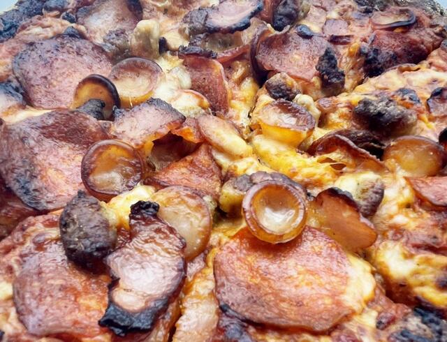 これら合計6種のミートに、濃厚なレッドチェダーチーズが絡むミートピザ。しかも今回のオーダーでは写真の通りの豪快ぶり。マグマのようなそのビジュアルを間に、いただく前からドキドキします。