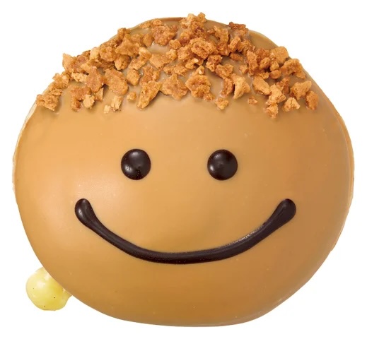 「キャラメル スマイル カスタード」は、濃厚なカスタードクリームを詰めたドーナツにキャラメルコーティングを施し、ビターチョコで笑顔を描いた可愛らしいドーナツです。